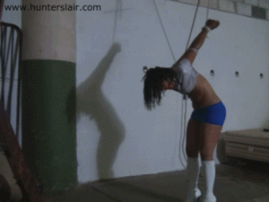 Petite blond Destine sits on a table top tightly bound and gagged. Chains hang from a pulley and are attached to her elbows and ankles. She struggle hopelessly on the table as the Hunter comes in. She screams into her gag as he pulls down on the chain hoisting her into the air. He hooks the chain secure and pulls the table out from under her. He toys with her spinning her around and swinging her in the chains. Then he produces a riding crop and starts beating her spandex covered ass. Destiny yelps into her gag with each swat but there is no way for her to avoid the blows.