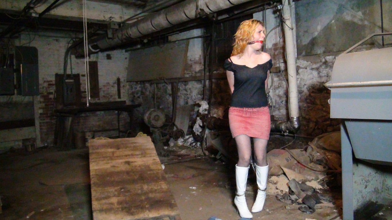 Pretty redhead Destine has been left in an old dusty vault with her wrists locked in steel handcuffs behind her back. Around her booted ankles she wears leg shackles and the leg shackles are chained with heavy steel chains to her handcuffs so she is XXXX to walked slowly hobbled. A huge red ball gag is jammed between her teeth as she plans her escape. She has no idea what is on the other side of the steel door or where it leads but she knows she can't stay here. She pushes at the door and to her surprise and relief the door swings open. Destine peers through the door into the dark. She then shuffles out the door and finds herself in an old basement. She looks for a way out shuffling along in her hobble cuffs searching from room to room. Her wanderings take her to a large steel door and she can feel fresh air coming around the edges of the door. She pushes at the door but it doesn't opens. She sees that a hasp holds the door shut but the hasp is at eye level and with her wrists locked in the handcuffs behind her back and attached to her leg shackles there is no way of reaching the hasp. She is XXXX to turn around and look for another way out. She wanders into a large room and before she has a chance to flee the Hunter finds her and drags her over to an old work table. He pushes her up onto the table and then unlocks the chain between her handcuffs and leg shackles. He then locks the chain around her throat and pulls the end of the chain down between the leg shackle chain and then weaves it through her handcuffs. Destine is left hog cuffed on the table and to tease her he drops the set of keys to her handcuffs and locks by her head. Destine looks at the keys and then struggles to get the keys to her bound hands. Using her head and nose she inches the keys back to her side. She near XXXXs herself trying to reach the keys with her outstretched fingers and finally manages to grab them. But that is only the first battle won. Now she has to try to feel for the key hole and try to maneuver the keys into the hole and free herself.